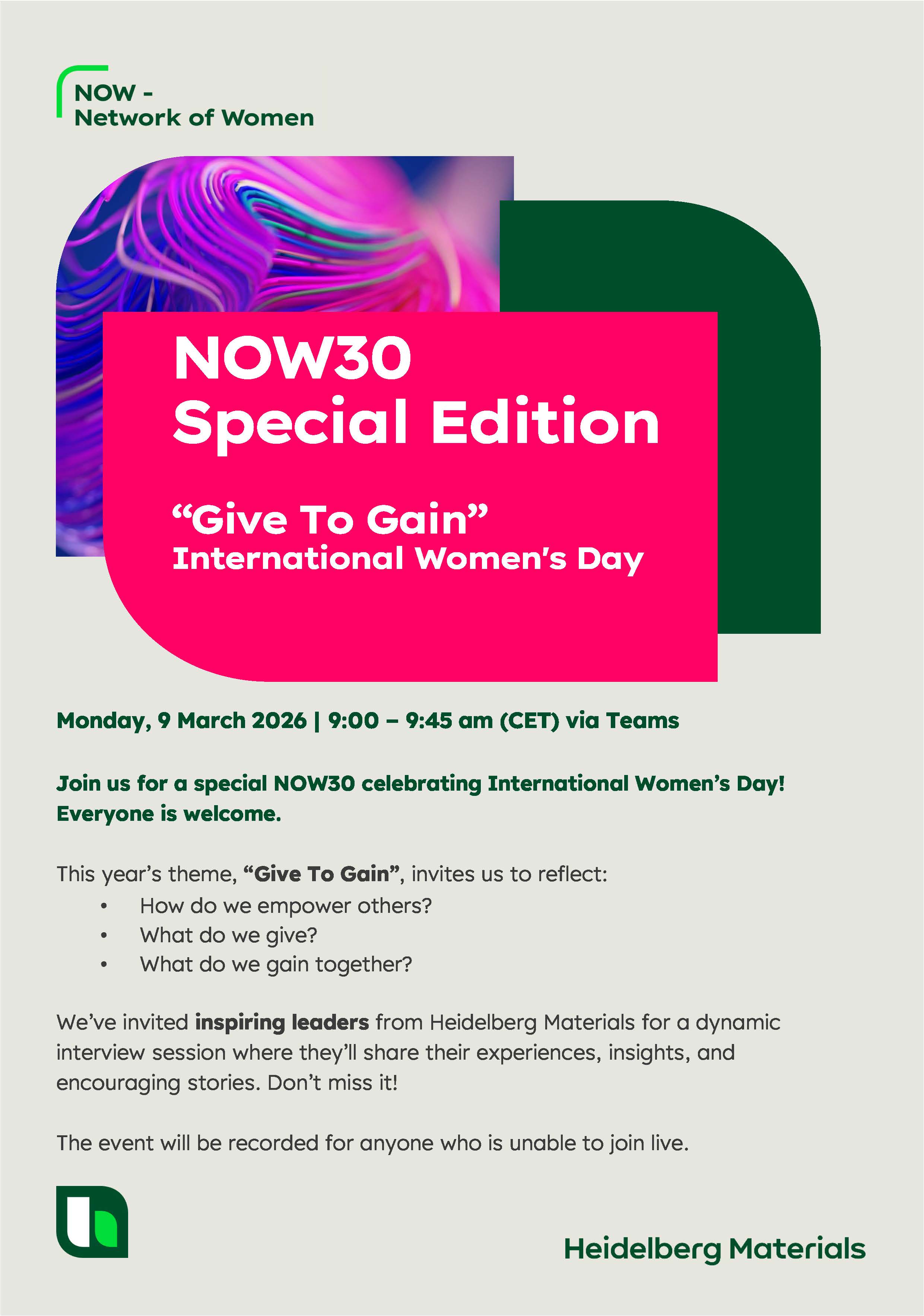 NOW * es la red global de networking para las empleadas de Heidelberg Materials, creada para fomentar una comunidad que conecta, apoya y potencia el talento femenino en toda la organización. Su propósito es claro: